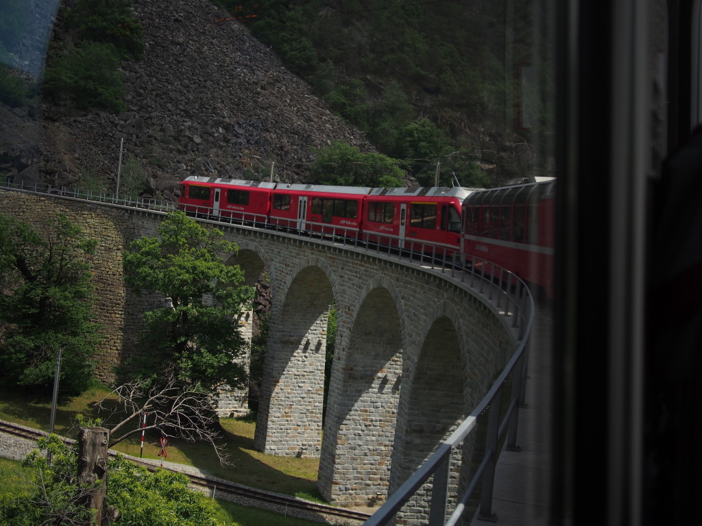 When we got onto the Bernina Express we didn’t see any seats on our tickets. Apparently, I hadn’t made reservations for the panoramic coaches, which were the whole reason we were taking this train. It was an extra 14 CHR to get seats and I was glad. We were joined on the train by another friendly lady from Chicago who wanted to chat our ear off. Luckily, we pawned her off on another couple from New Zealand so we could enjoy the ride and scenery.
